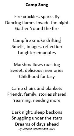 Poetry was not my interest for most of my life. Lately, however, I have grown to really enjoy it. I have even dabbled in writing a few poems myself. The one I will share here is one that is several stanzas of haiku poems grouped together to form one poem about one of my favorite activities, sitting around the campfire while camping.